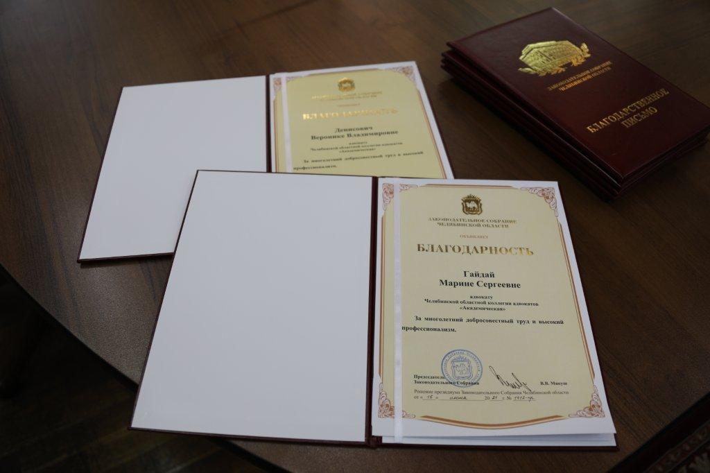 Председатель комитета по законодательству, государственному строительству и местному самоуправлению Анатолий Брагин и его заместитель Ольга Мухометьярова наградили благодарственными письмами Законодательного Собрания за многолетний добросовестный труд и высокий профессионализм адвокатов Челябинской областной коллегии адвокатов «Академическая». Мероприятие прошло с соблюдением масочного режима и других мер по профилактике распространения коронавирусной инфекции.