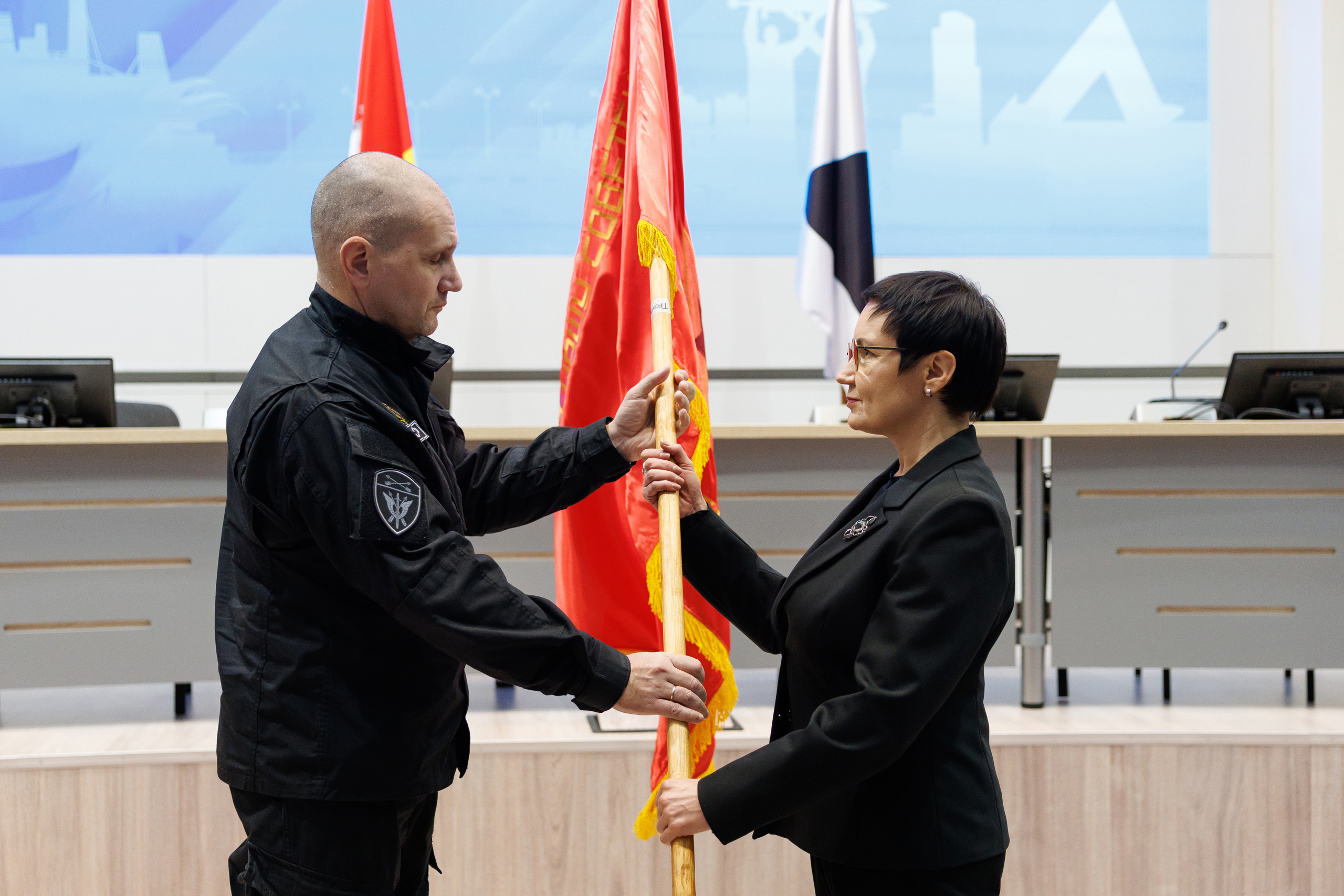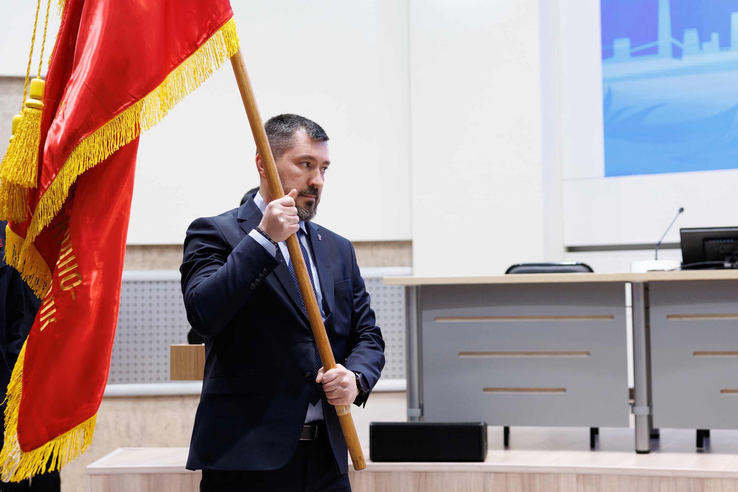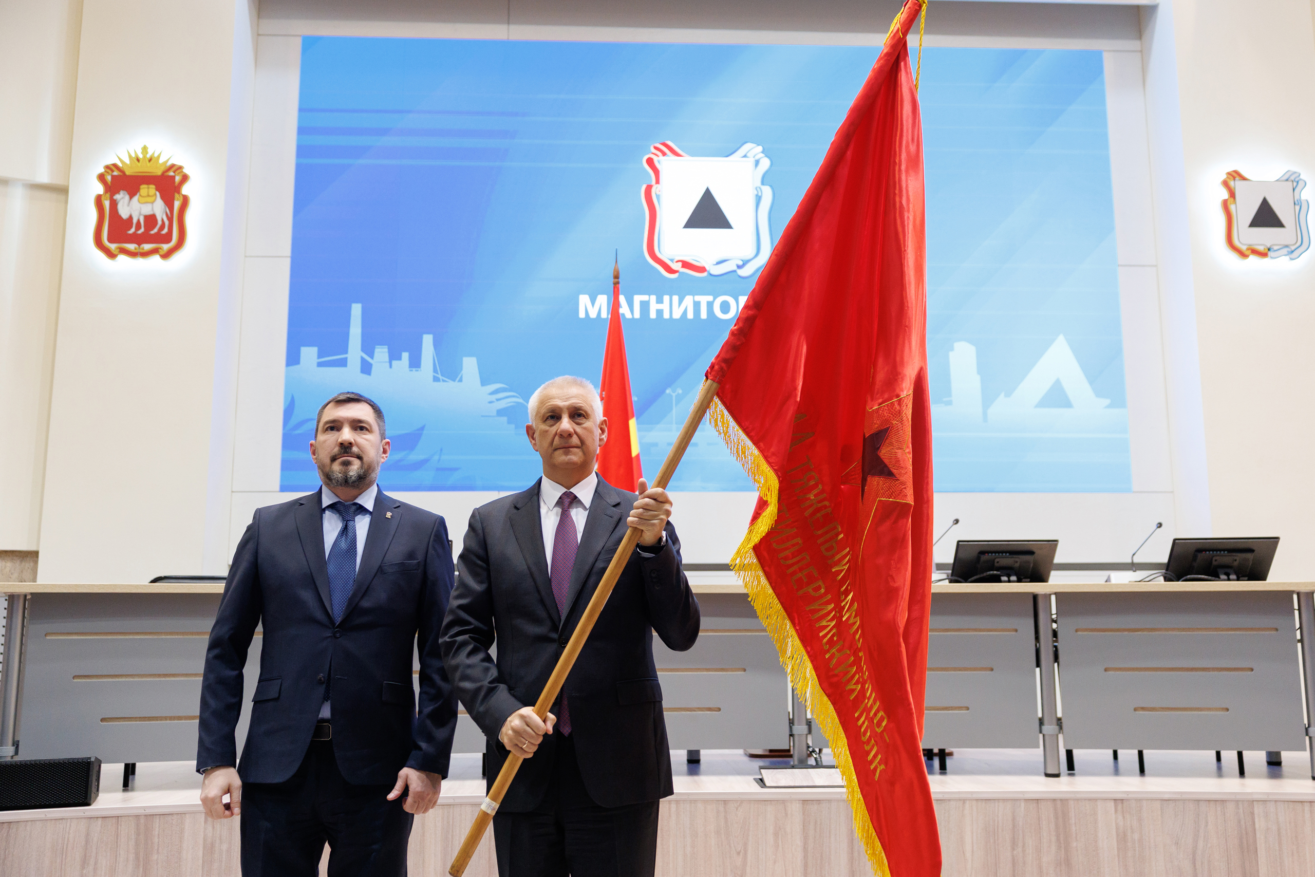 Копию боевого знамени 1548-го тяжелого самоходно-артиллерийского полка Денис Моисеев передал генеральному директору публичного акционерного общества «Магнитогорский металлургический комбинат», заместителю председателя Законодательного Собрания Павлу Шиляеву.