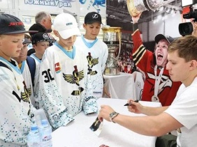 Уникальную возможность прикоснуться к Кубку Гагарина и стать счастливыми обладателями автографа Дениса Зернова получили воспитанники Ледовой Арены "Южный Урал", жители Южноуральска и все поклонники хоккея.
